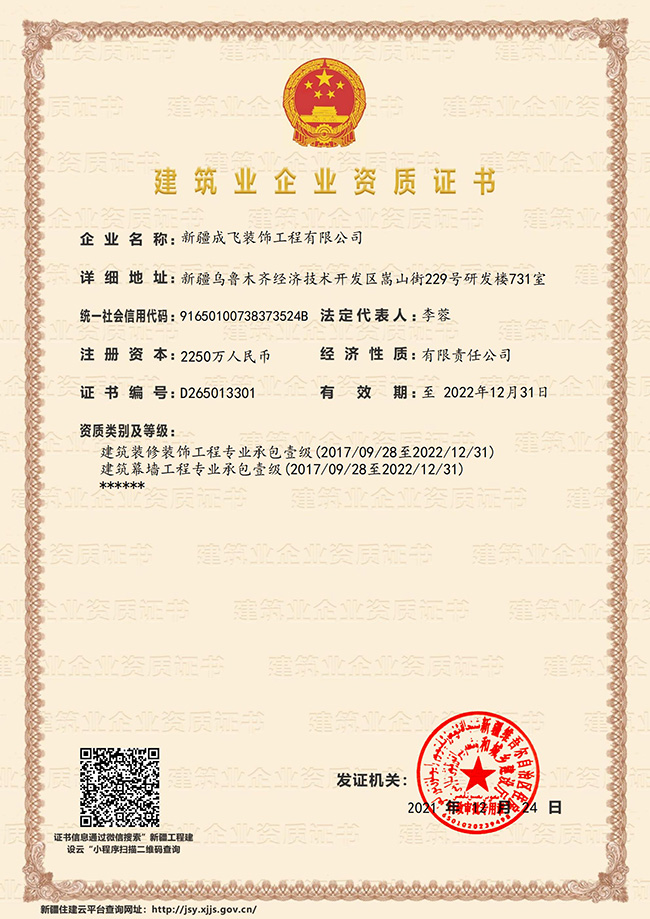 新疆成飛建設工程有限公司是一家以專注于裝飾工程領域,堅持穩健經營、持續創新、開放合作的原則,在星級賓館、高檔寫字樓、大型商場、高級餐館、娛樂設施、車站、銀行等大型室內外建筑工程(包括各類玻璃幕墻、石材幕墻、鋁板幕墻、鋼結構室內裝飾等工程)裝飾裝修...查看更多